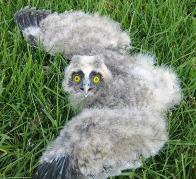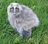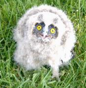 Baby Kautz zu früh aus dem Nest gefallen. Kautzeltern saßen im Baum, wachend, über ihm. |